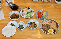 この日のメニューは、とんこつのおでん風煮込み(鹿児島の郷土料理の一つ)、肉じゃが、サラダ、もずくの酢の物、マンゴーの漬物、玄米、フルーツです。