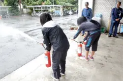 全員、練習用の水が出る消火器を体験させていただきました。